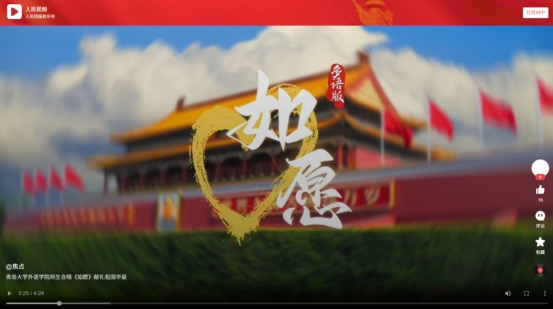 精心策划并组织开展红色歌曲《如愿》MV 拍摄活动。学院全体师生积极参与,发挥专业优势,以多国语言深情合唱的形式传递对祖国的赤诚祝福。视频一经发出,吸引了校内外众多媒体的关注,学习强国、人民网、央视频等多家媒体相继转发推广,获得了一致好评。